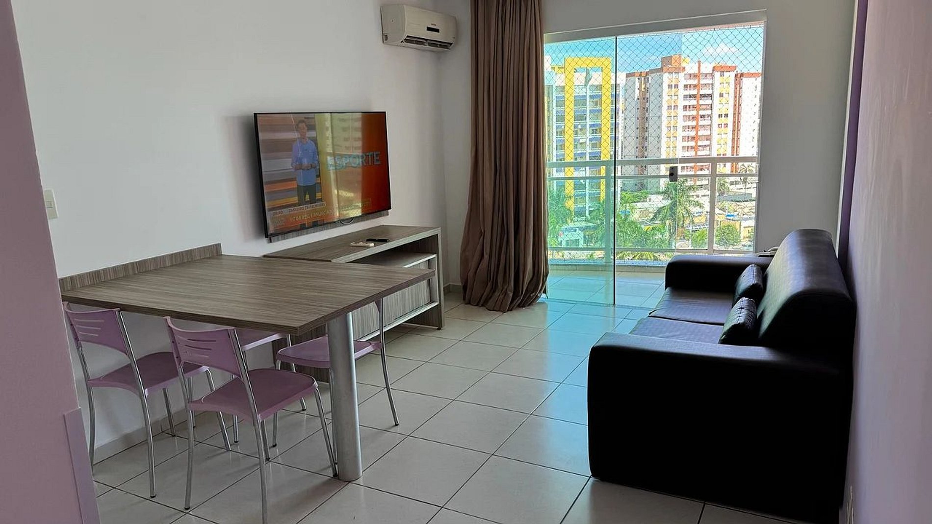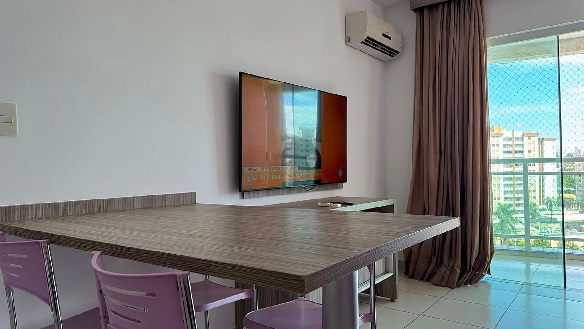 - Janela com tela de proteção, frente para as piscinas